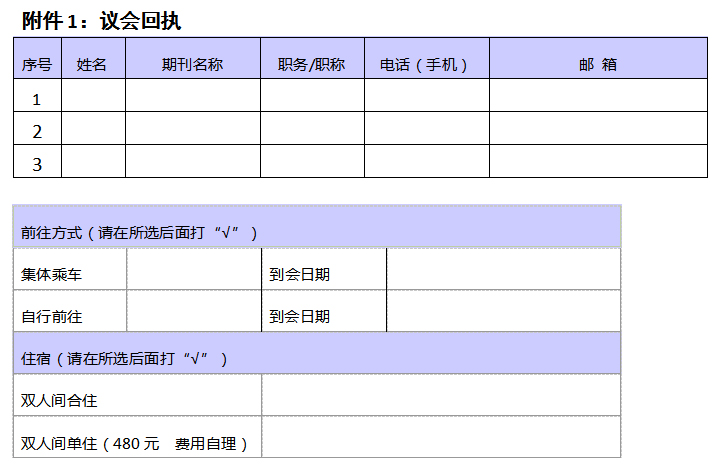 本次会议食宿统一安排,不收会务费。请务必在回执中标注前往方式和是否合住等内容。
